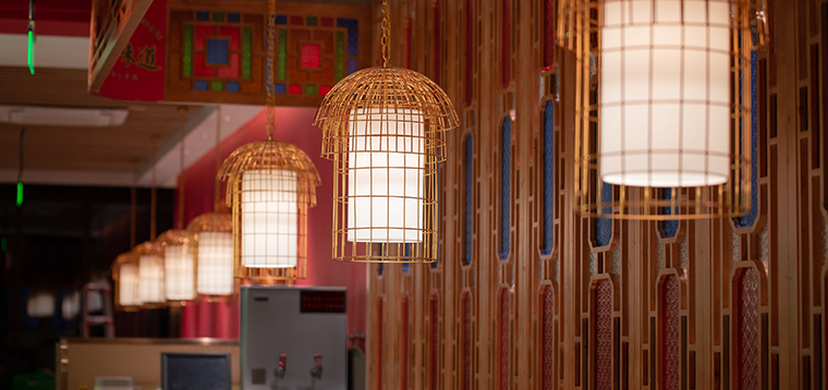 上海寶粵樓廣式點心茶樓,該空間的吊燈就是仿老廣州人提籠遛鳥喝早茶的情形,將鳥籠做成了吊燈造型,與品牌整體氛圍融為一體。