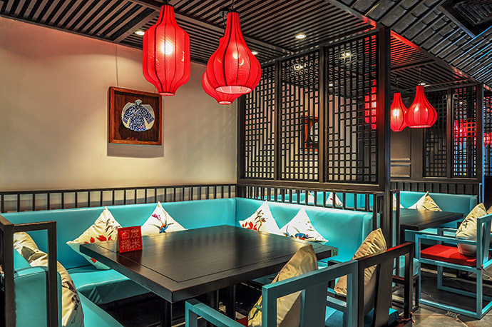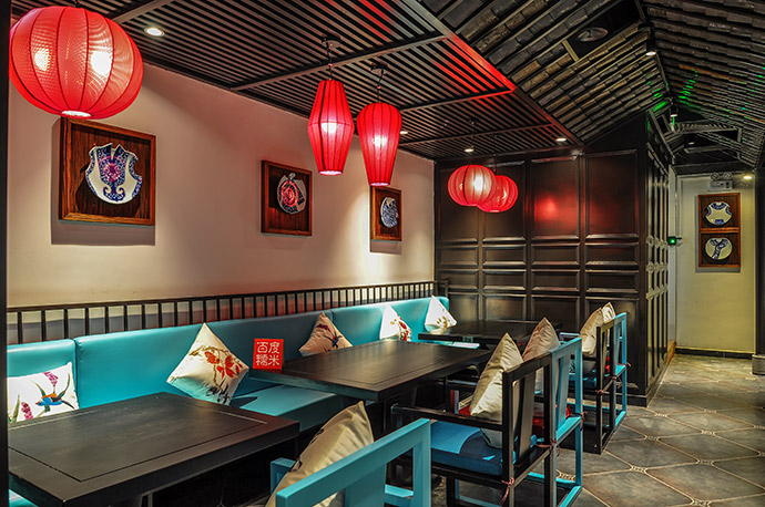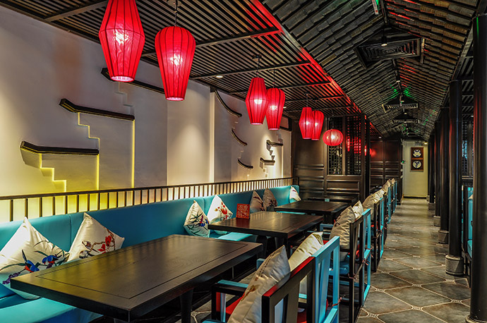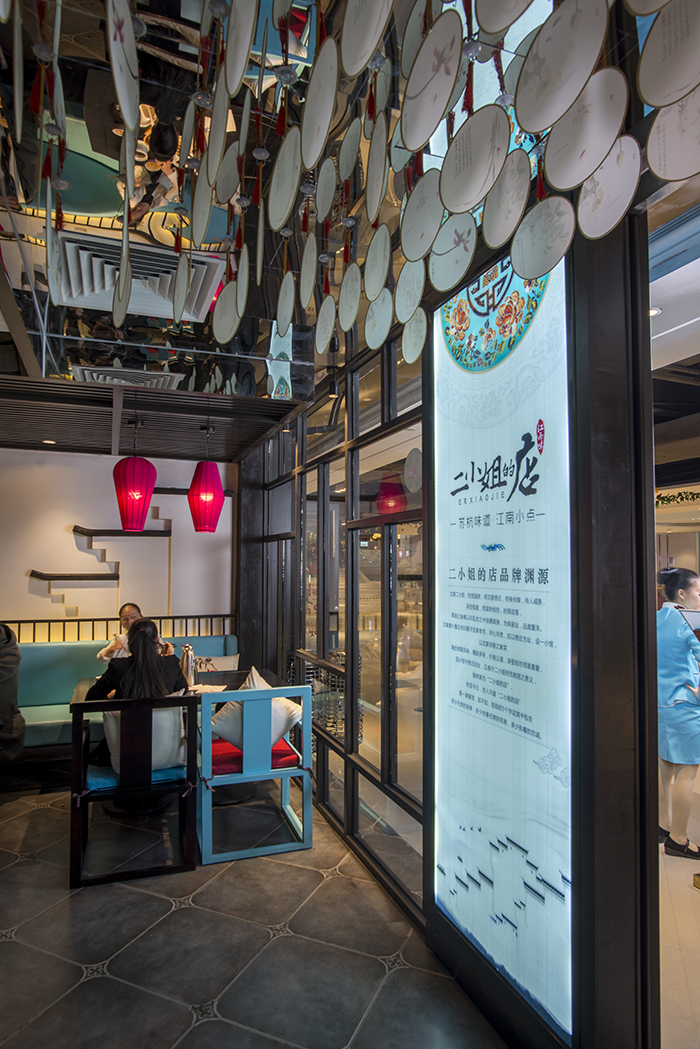 有了識(shí)別度高的平面形象,我們更要有強(qiáng)烈的有鮮明的主題風(fēng)格,或清新、或時(shí)尚歡快的空間裝飾,所以在空間設(shè)計(jì)上,我們充分依托中式風(fēng)和蘇繡元素。