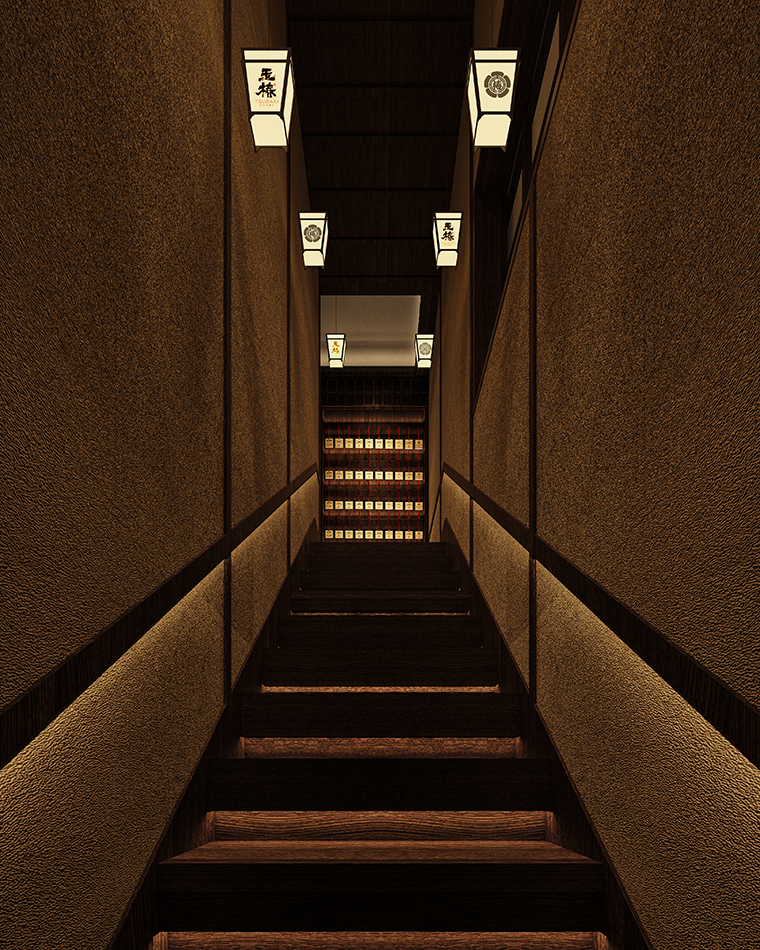 2、一樓大廳及吊頂的設計:把京都的古老街道,巷子搬到我們店里。整個大廳的頂部環(huán)繞一圈日式黑瓦頂,四周幾個日式玻璃木窗,與地面的青石瓦面,墻體的稻草漆,燒烤吧臺形成一體化的京都風格。置身其中,仿佛漫步于京都的古老美食街道中,熙熙攘攘,熱鬧非凡,抬頭間還能看見二樓的日本侍女正在推開窗戶,朝著樓下觀望。